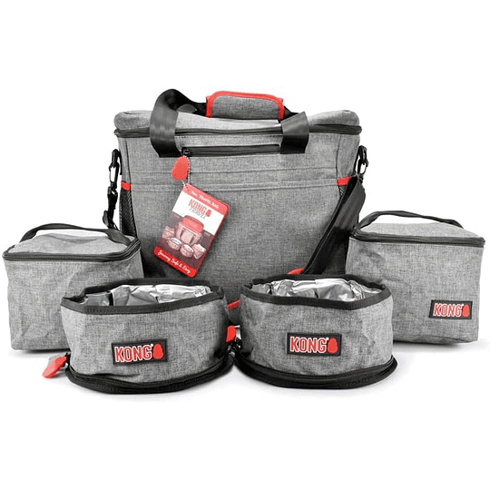 KONG Dog Travel Bag 5PC es una bolsa de viaje para perros de cinco piezas que hace que sea fácil empacar y partir. Dos recipientes de almacenamiento de alimentos aptos para alimentos mantienen los alimentos frescos hasta la hora de comer.